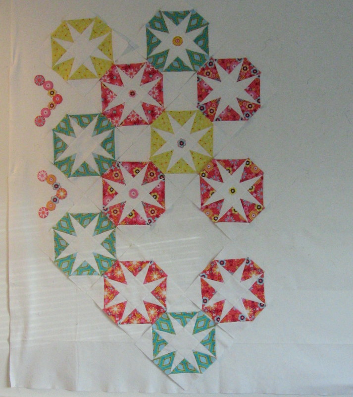 De laatste weken ben ik niet erg opgeschoten met de babyquilt. Gelukkig heb ik nog een paar maanden de tijd! Op het moment komt er veel te weinig van quilten naar mijn zin, maar als ik ermee bezig ben is het met deze quilt. Dit is de stand van zaken tot nu toe: